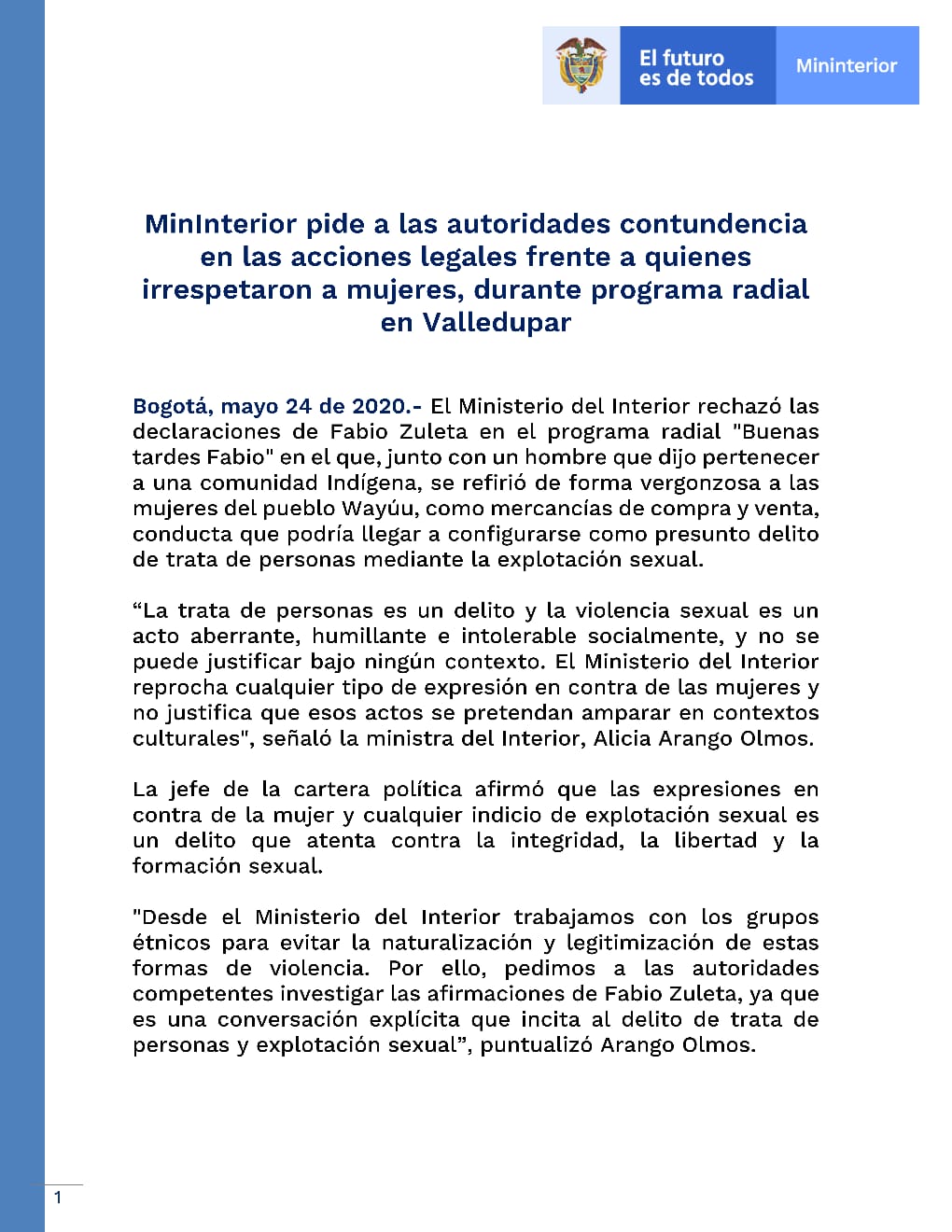 En un comunicado emitido el día de hoy, esta entidad expresa que “el Ministerio del Interior rechazó las declaraciones de Fabio Zuleta en el programa radial “Buenas tardes Fabio” en el que, junto con un hombre que dijo pertenecer a una comunidad indigena, se refirió de forma vergonzosa a las mujeres del pueblo Wuayúu, como mercancías de compra y venta, conducta que podría llegar a configurarse como presunto delito de trata de personas mediante la explotación sexual”