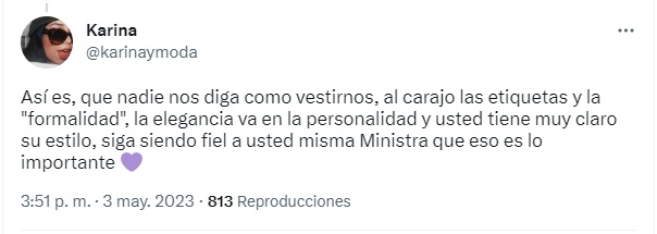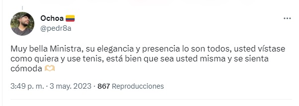 Estas criticas al parecer cobraron tanta fuerza en redes, que la ministra decidió salir a defenderse y recordar como lo hizo hace un tiempo, que llevar zapatos bajos (tenis) a algún evento de este tipo, no tiene nada de malo, porque esto que complementa su “pinta” no define lo que realmente representa ella.