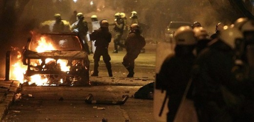 Protestantes queman un automóvil el 7 de abril de 2015, durante una protesta en la que además se presentaron disturbio con la policía a las afueras de la Universidad Politécnica en Atenias. EFE/Archivo
