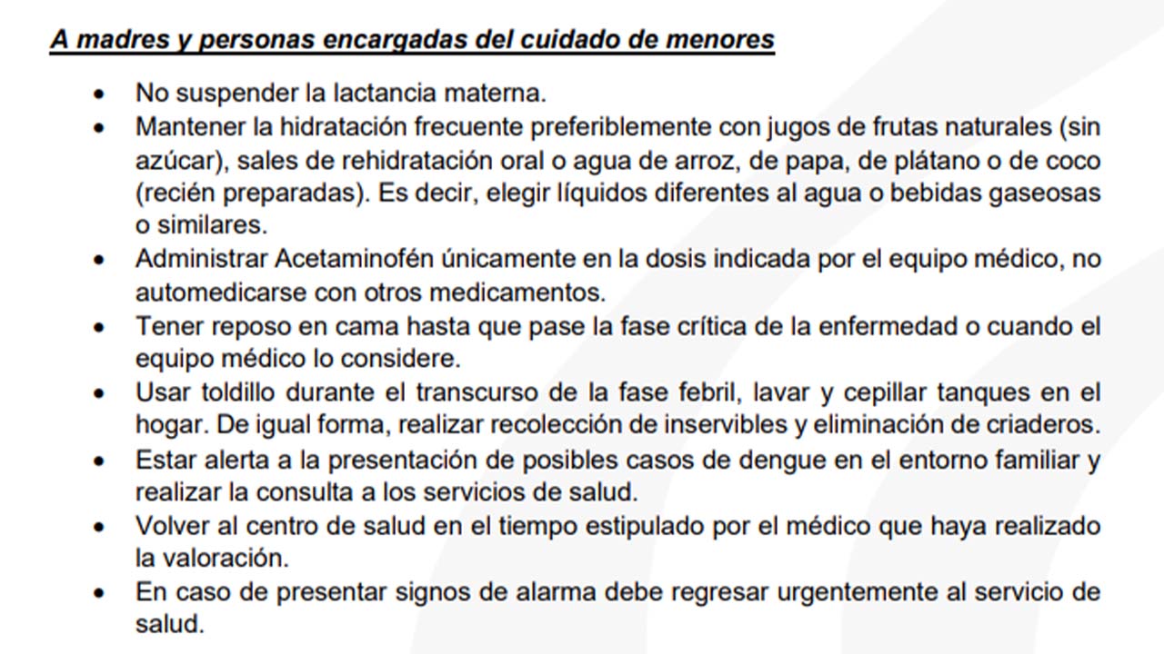 El Ministerio de Salud establece por medio de la circular 013 de 2023, que el dengue es un proceso prioritario para la atención en instituciones prestadoras de servicios de salud; además hace parte de la Ruta Integral de Atención en Salud para reducir las barreras de acceso.