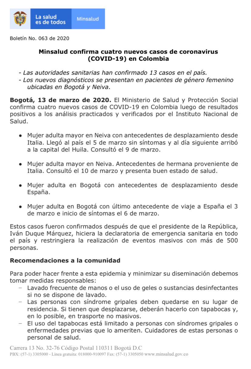 El Ministerio de Salud de Colombia amplió los datos sobre los cuatro nuevos casos de contagio por Covid-19 en el territorio nacional, mismos que amplian la cifra a 13 casos en total.