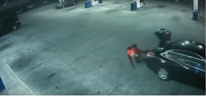 En una lucha por salvarse de una experiencia terrorífica, esta mujer sale despedida del baúl de un auto en movimiento en una gasolinera de Alabama, en los Estados Unidos.