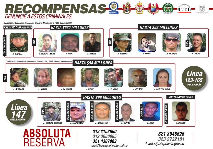 Este cartel, que incluye las fotografías de los 21 principales cabecillas de estas organizaciones, cuenta con las recompensas establecidas en las directivas ministeriales ordenadas por el Ministerio de Defensa Nacional. De esta manera se busca dar con el paradero de estos criminales, responsables de atentar contra la población civil y la Fuerza Pública.