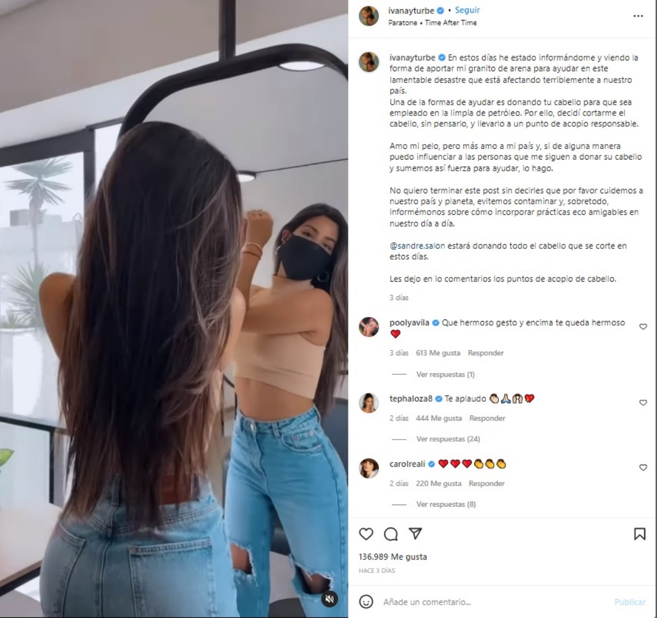 “En estos días he estado informándome y viendo la forma de aportar mi granito de arena para ayudar en este lamentable desastre que está afectando terriblemente a nuestro país. Una de la formas de ayudar es donando tu cabello para que sea empleado en la limpia de petróleo. Por ello, decidí cortarme el cabello sin pensarlo y llevarlo a un punto de acopio responsable”, escribió en su Instagram.
