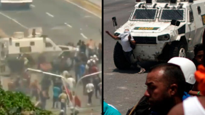 En video quedó registrado el momento en el que un vehículo de la Guardia Nacional venezolana atropelló a varios manifestantes frente a una base militar en Caracas.