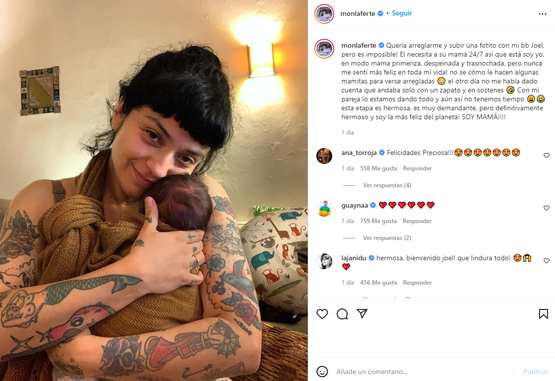 La imagen fue acompañada con un mensaje sobre cómo han sido los primeros días como mamá: “Quería arreglarme y subir una fotito con mi bebé Joel, pero es imposible. Él necesita a su mamá 24/7 así que esta soy yo, en modo mamá primeriza, despeinada y trasnochada, pero nunca me sentí más feliz en toda mi vida. No sé cómo le hacen algunas mamitas para verse arregladas”.