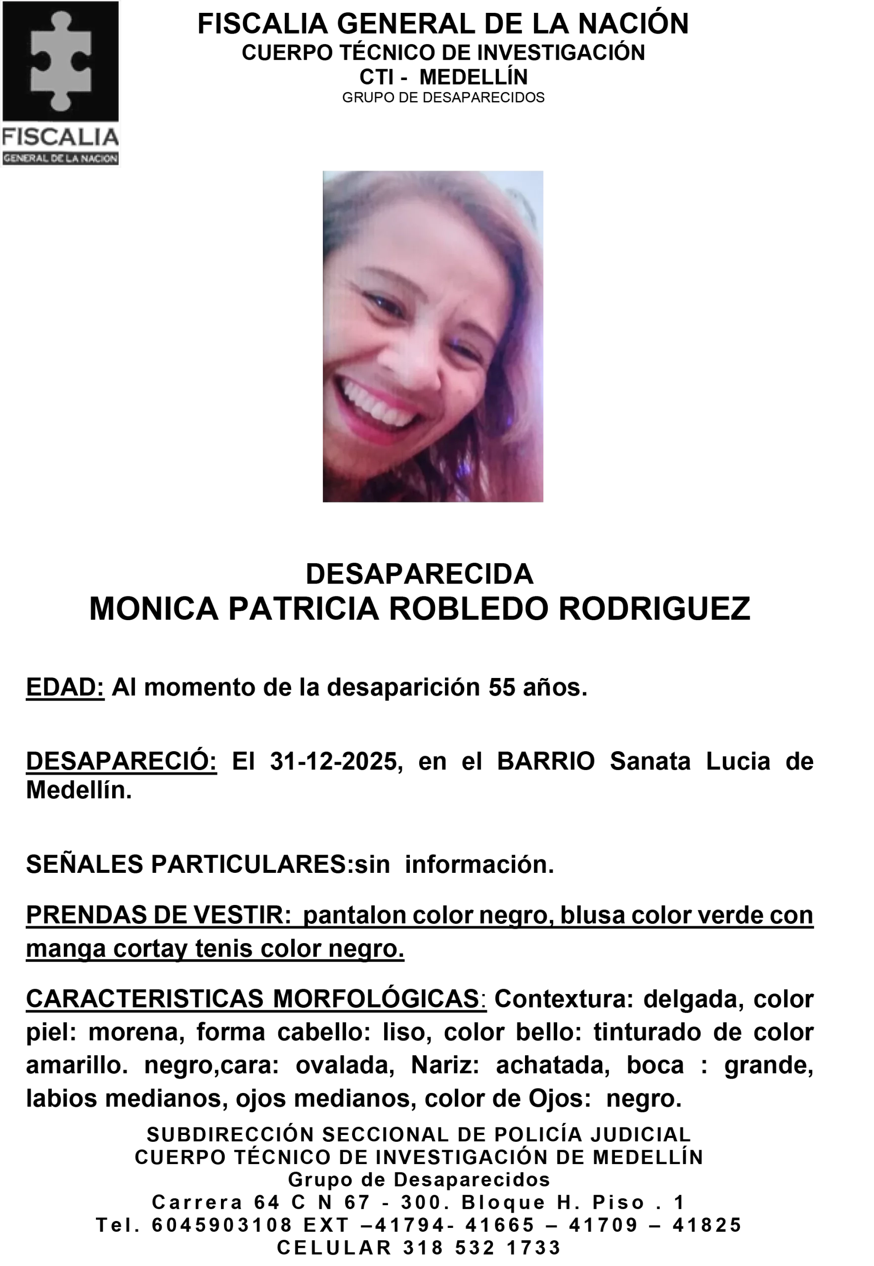 Mónica Patricia Robledo Rodríguez tenía 55 años al momento de su desaparición. Fue vista por última vez el 31 de diciembre de 2025 en el barrio Santa Lucía de la ciudad de Medellín.