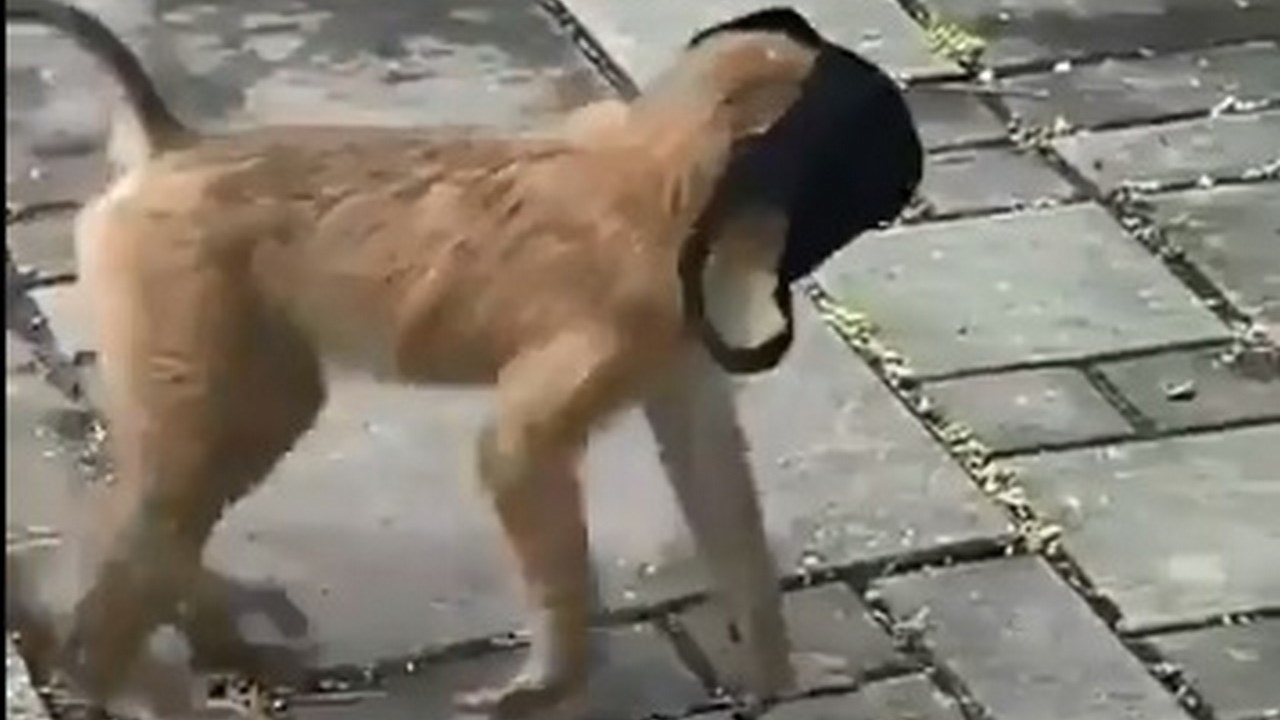 En la grabación se ve a varios monos, uno de ellos agarró un tapabocas que estaba tirada en la calle y luego se lo ubicó de forma correcta: cubriendo su nariz y boca.