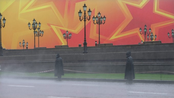 La lluvia azota Moscú mientras dos agentes de la policia rusa patrullan por las calles de la capital.