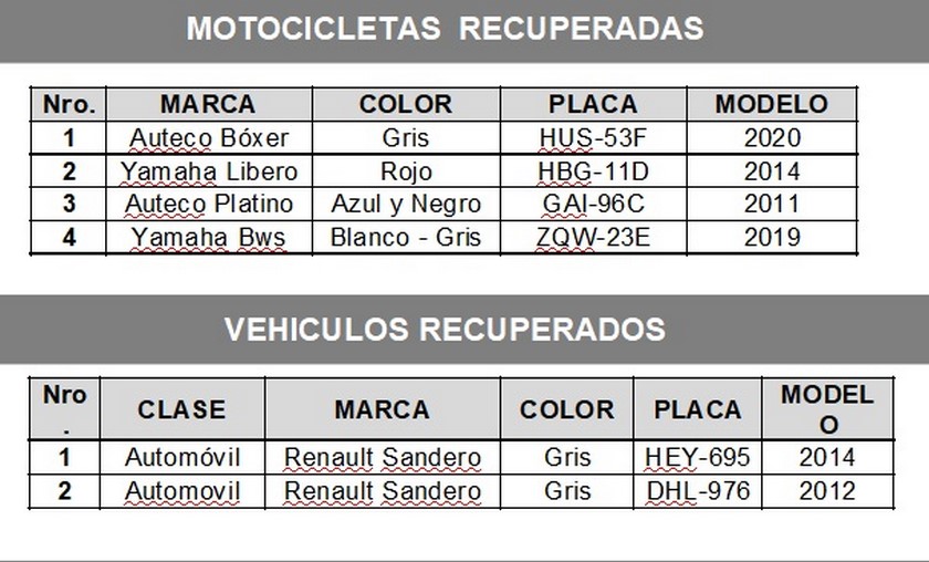 La Policía Metropolitana del Valle de Aburrá dio a conocer las placas las motocicletas y el vehículo recuperado recientemente durante operativos.