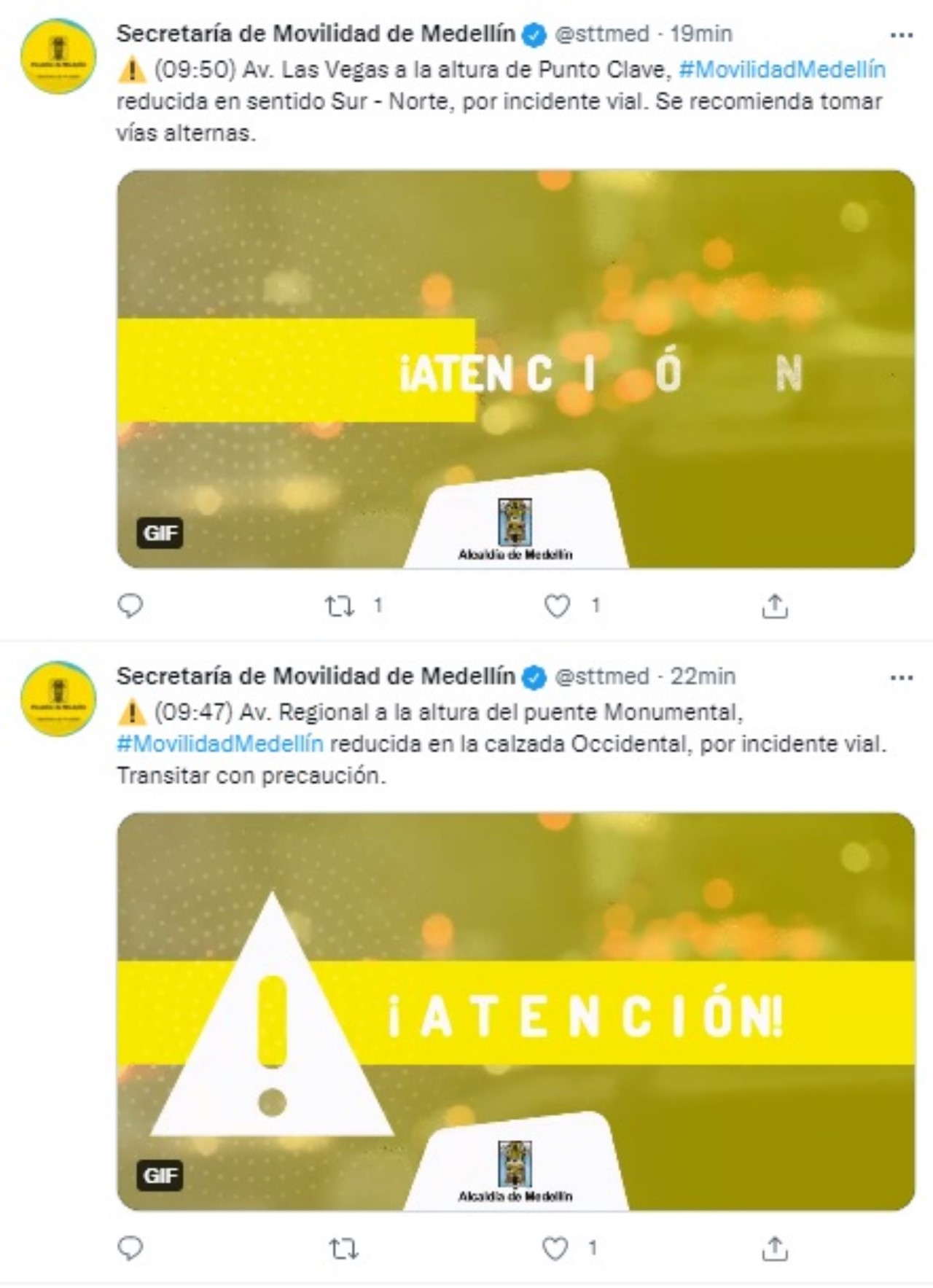 A través de la cuenta de Twitter de la Secretaría de Movilidad de Medellín informaron algunos incidentes de tránsito en las calles de la ciudad por la que piden tomar vías alternas.