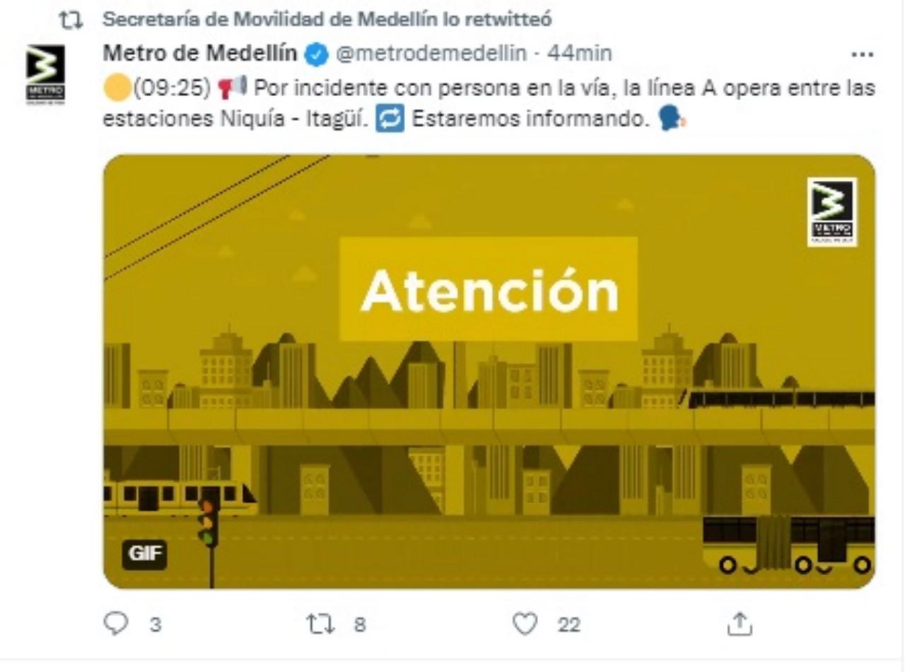 El Metro de Medellín también informó que a eso de la 9:25 a.m. “Por incidente con persona en la vía, la línea A opera entre las estaciones Niquía – Itagüí. Estaremos informando”, detalló la Empresa de Transporte Masivo del Valle de Aburrá.