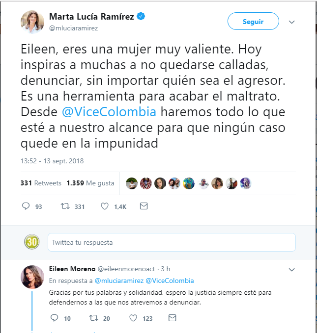 La actriz le responde por la misma red social, le agradece por las palabras a Marta Lucía y añade: “Espero la justicia siempre esté para defendernos a las que nos atrevemos a denunciar”.