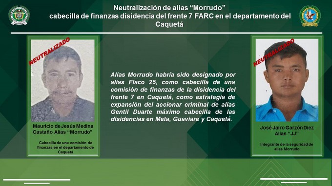 El jefe de finanzas de una disidencia del Frente Primero de las FARC, Mauricio de Jesús Medina, alías “Morrudo”, murió en una operación realizada por la Policía colombiana en el departamento del Caquetá, informó hoy el ministro de Defensa, Luis Carlos Villegas.