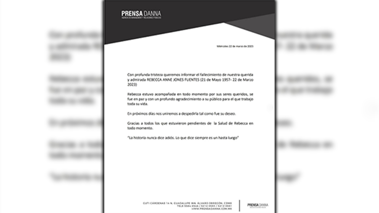 “Con profunda tristeza queremos informar el fallecimiento de nuestra querida y admirada REBECCA ANNE JONES FUENTES (21 de Mayo 1957- 22 de Marzo”, así lo dio a conocer su representante, Danna Vázquez, a través de un comunicado publicado en las redes sociales.