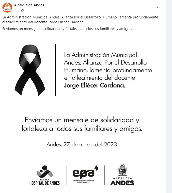 De acuerdo con versiones, el docente, al parecer se habría quitado la vida con un arma de fuego en el aula en el que dictaba clases en el municipio de Andes, Antioquia.