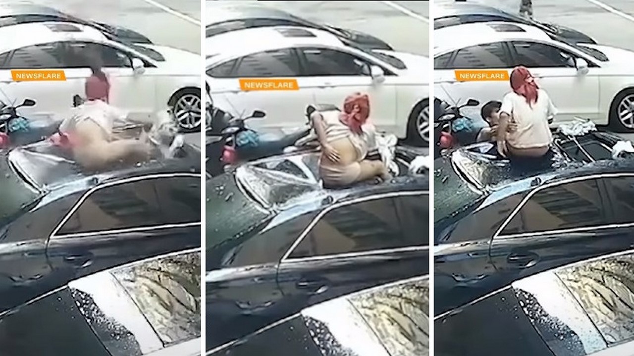 Las cámaras de seguridad del edificio capturaron el momento exacto en el que la mujer cae sobre el techo de un vehículo estacionado y afortunadamente sobrevivió.
