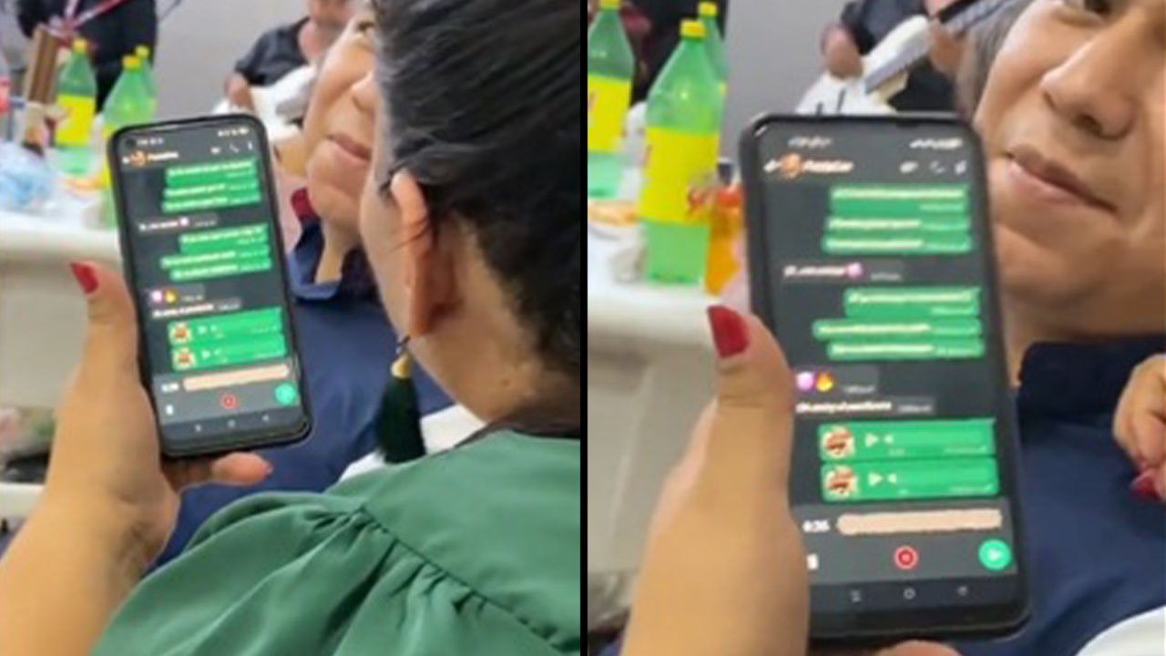 Y hasta allí, todo muy bonito, el problema y lo que causa asombro, es que al hacer zoom para ver el celular que esta mujer siempre tuvo en la mano, se pudo observar que estaba teniendo una conversación con quien sería su amante, pero a quien tenia guardado como ‘pestañas’.