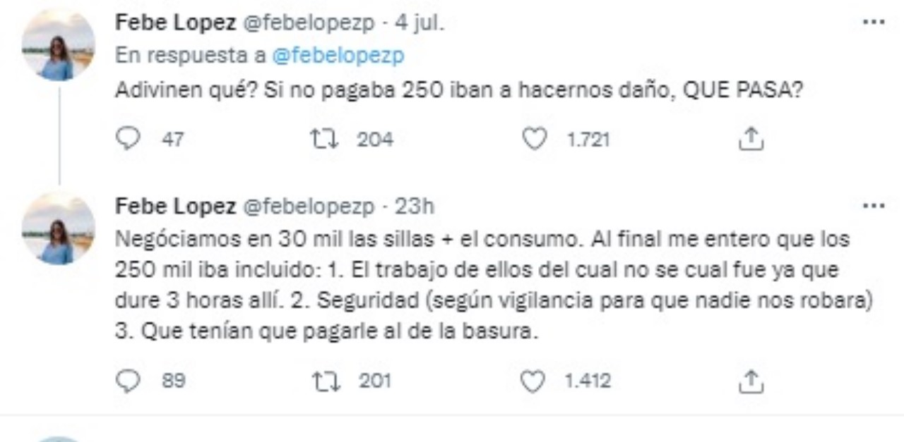Y agregó: “Negócianos en 30 mil las sillas + el consumo. Al final me entero que los 250 mil iba incluido: 1. El trabajo de ellos del cual no se cual fue ya que dure 3 horas allí. 2. Seguridad (según vigilancia para que nadie nos robara) 3. Que tenían que pagarle al de la basura”.