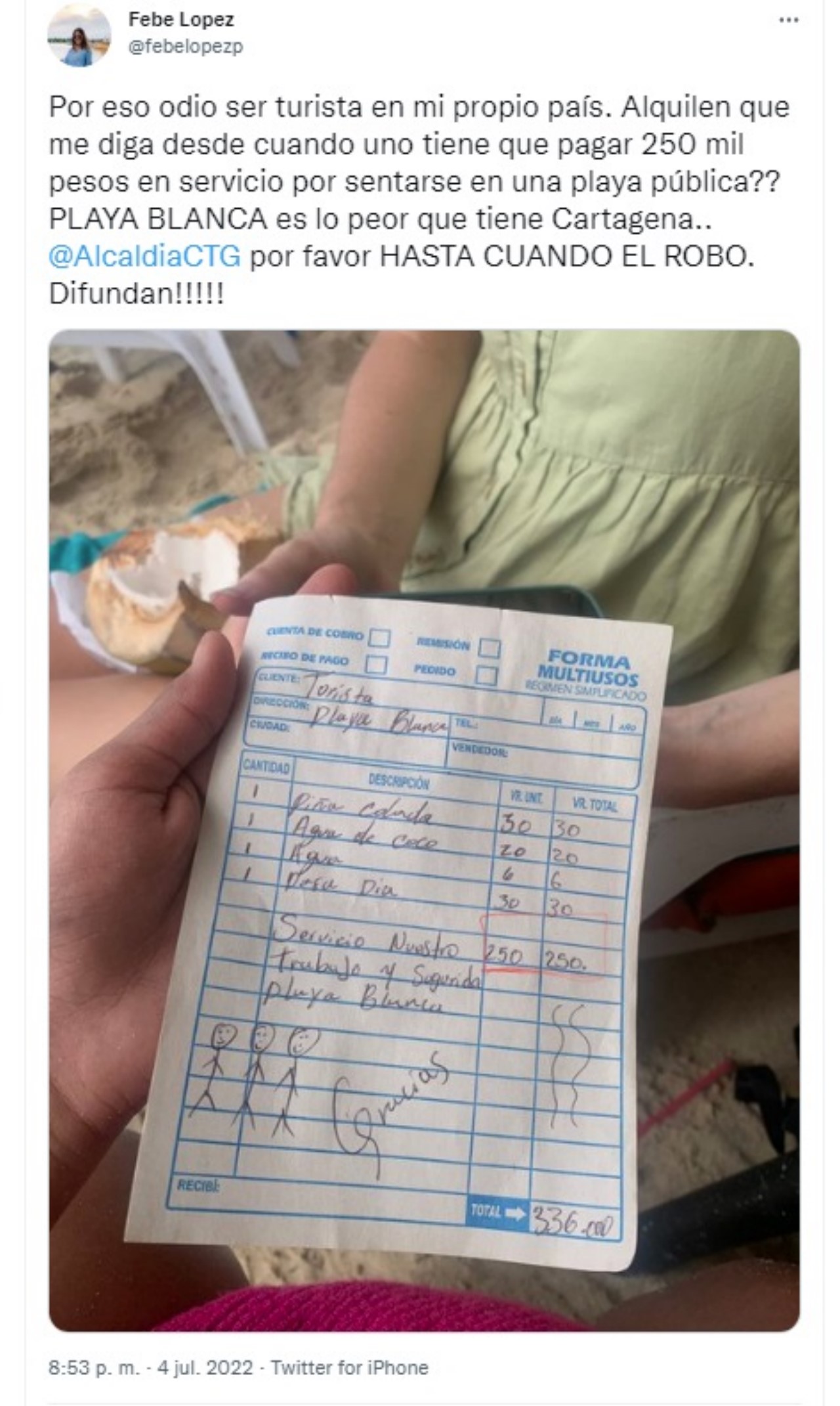 “Por eso odio ser turista en mi propio país. Alquilen que me diga desde cuando uno tiene que pagar 250 mil pesos en servicio por sentarse en una playa pública?? PLAYA BLANCA es lo peor que tiene Cartagena.. por favor HASTA CUANDO EL ROBO. Difundan”, escribió la mujer y mostró una foto del recibo que le dieron.