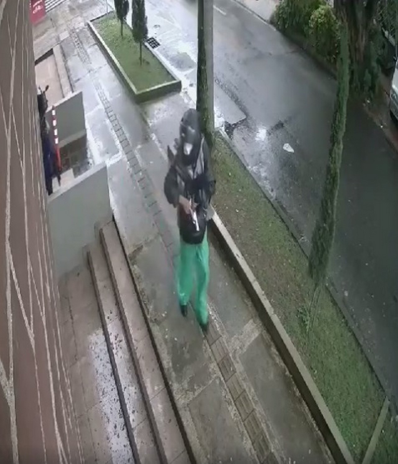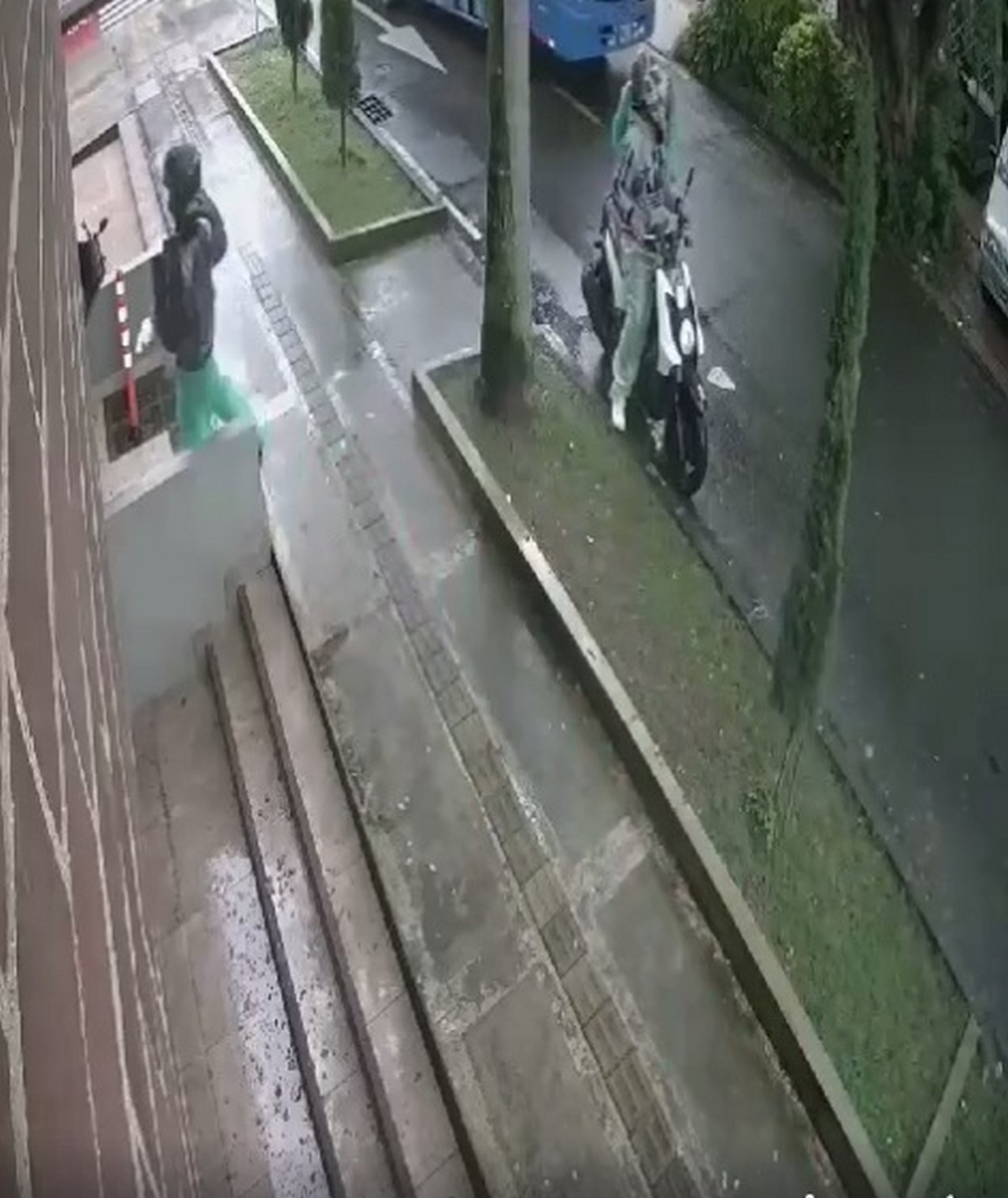 En el video se ve que el hombre camina hasta donde se encuentra la mujer con un bolso colgado y una pistola en la mano, con la que habría intimidado a la mujer, quien afirmó que las pertenencias tendrían un valor de casi 6 millones de pesos.