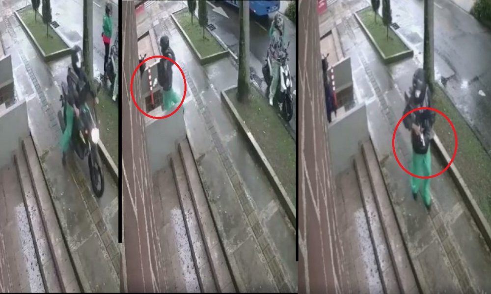 En el video se ve que el hombre camina hasta donde se encuentra la mujer con un bolso colgado y una pistola en la mano, con la que habría intimidado a la mujer, quien afirmó que las pertenencias tendrían un valor de casi 6 millones de pesos.