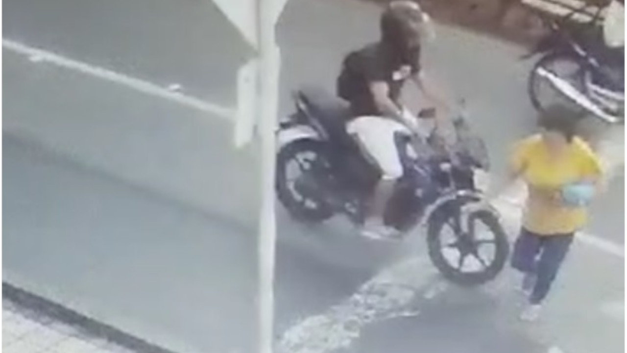 En video de cámara de seguridad quedó el momento exacto en el que un motociclista ‘levanta’ a una mujer que pasaba por la cebra peatonal.