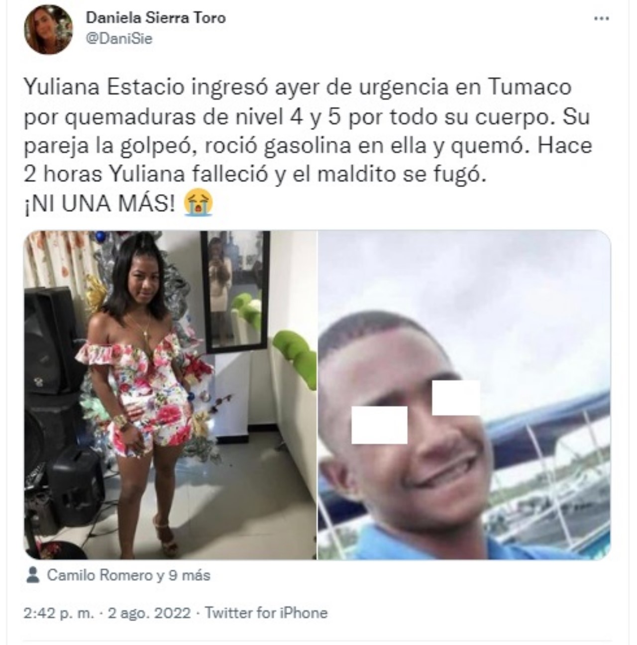 Yuliana Estacio, reina de belleza de Tumaco, habría sido agredida por su pareja quien la habría golpeado, luego le roció gasolina y le prendió fuego.