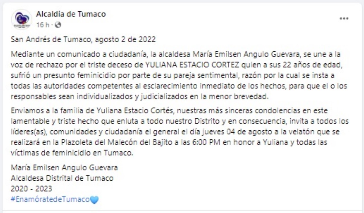 La Administración Municipal de Tumaco anunció en su cuenta de Facebook, “la alcaldesa María Emilsen Angulo Guevara, se une a la voz de rechazo por el triste deceso de YULIANA ESTACIO CORTEZ quien a sus 22 años de edad, sufrió un presunto feminicidio por parte de su pareja sentimental, razón por la cual se insta a todas las autoridades competentes al esclarecimiento inmediato de los hechos, para que el o los responsables sean individualizados y judicializados en la menor brevedad”.