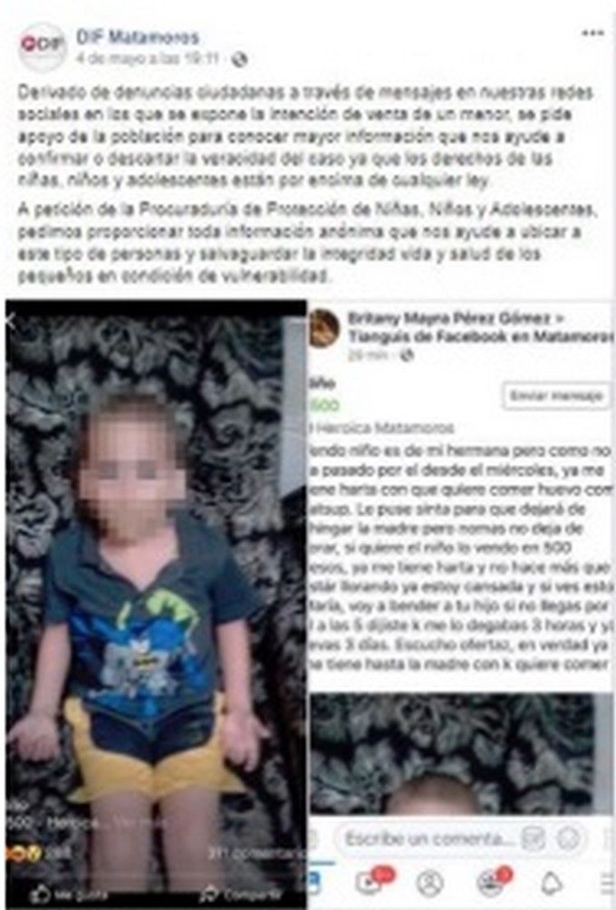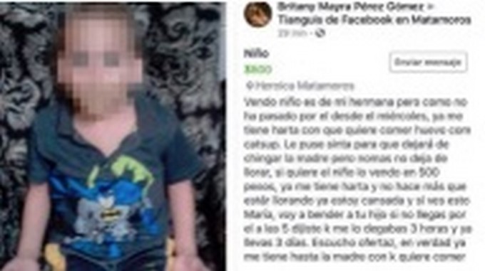 En redes sociales circula la foto de un niño que, de acuerdo con una publicación de Facebook, está a la venta por 500 pesos en Matamoros, México, ya que “tiene harta” a su tía porque no deja de llorar y pedir “huevo con salsa de tomate”.