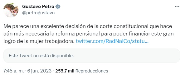 El Presidente de Colombia Gustavo Petro celebró este martes la decisión de la Corte que declaró inconstitucional la exigencia de 1.300 semanas de cotización para que las mujeres obtengan su pensión, teniendo en cuenta la evidencia de barreras y obstáculos para el acceso y la permanencia en el mercado laboral.