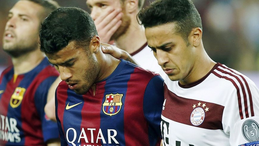 El centrocampista del Bayern de Munich Thiago Alcántara (d) y su hermano Rafinha, del FC Barcelona, tras el partido de ida de la semifinal de la Liga de Campeones