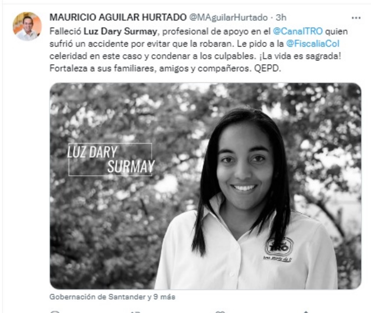 “Testigos de este lamentable hecho indicaron que dos motos se habían estrellado (…) Sin embargo, hay quienes dicen que a ella le estaban intentando quitar y por eso se produjo el golpe”, señaló el coronel Jose Óscar Jaramillo, comandante de la Policía Metropolitana de Bucaramanga.