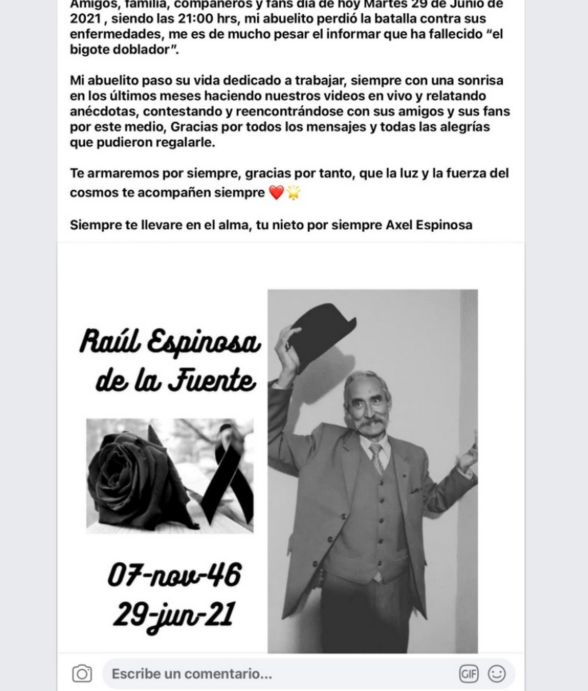 Uno de los nietos, Axel Espinosa, expresó estás palabras en Facebook: “perdió la batalla contra sus enfermedades”. De hecho, él fue quien anunció el fallecimiento de su abuelo, quien también era conocido como “el bigote doblador”.
