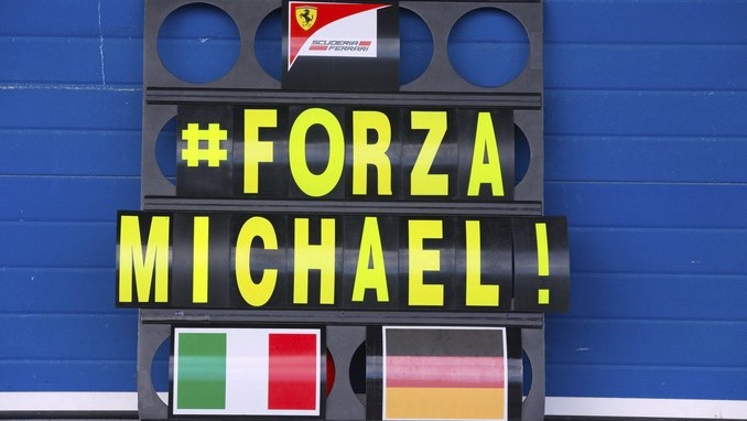 Un letrero con el mensaje “Forza Michael” en el box de Ferrari. EFE/Archivo