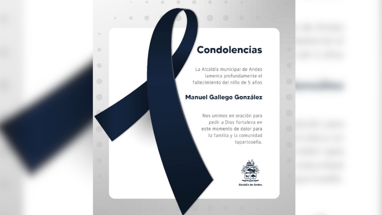 “La alcaldía municipal de Andes, lamenta profundamente el fallecimiento del niño de 5 años, Manuel Gallego González.