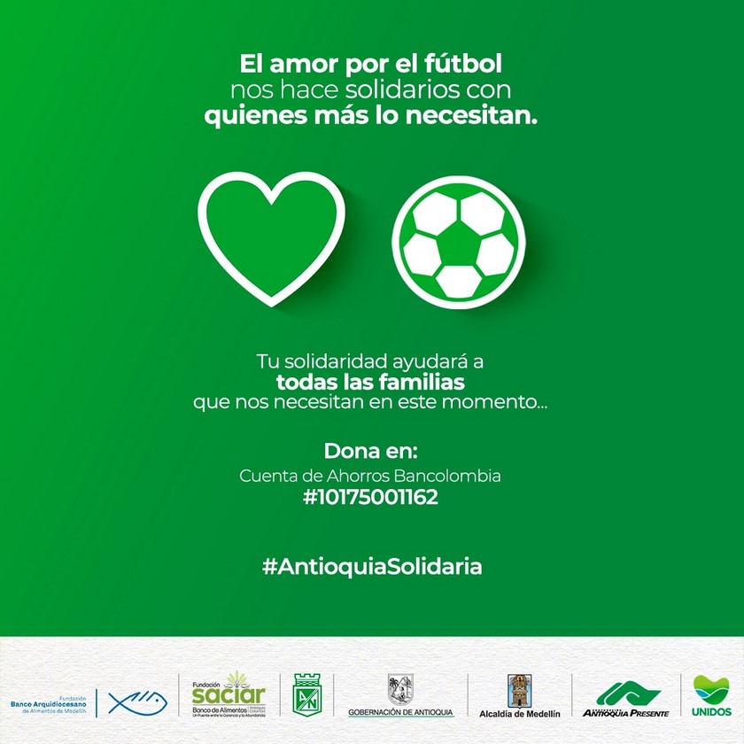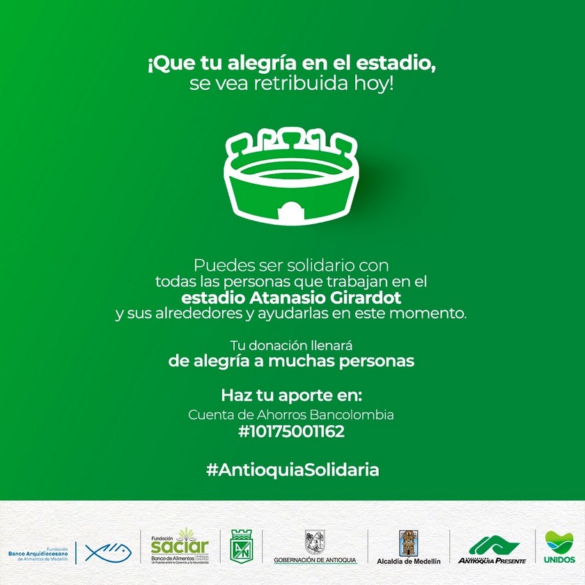 Minuto30.com- Varias instituciones de la ciudad de Medellín, entre ellas Atlético Nacional, lideran una campaña que busca apoyar a los venteros de la Unidad Deportiva Atanasio Girardot, que por estos días viven una complicada situación económica de cuenta del receso de actividades al que ha obligado la aparición del Coronavirus.