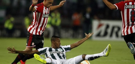 Jonathan Copete (c) de Atlético Nacional ante Matías Aguirregaray (i) de Estudiantes de La Plata, el jueves 5 de marzo de 2015, durante un partido del grupo 7 de la Copa Libertadores de América 2015 en Medellín. EFE