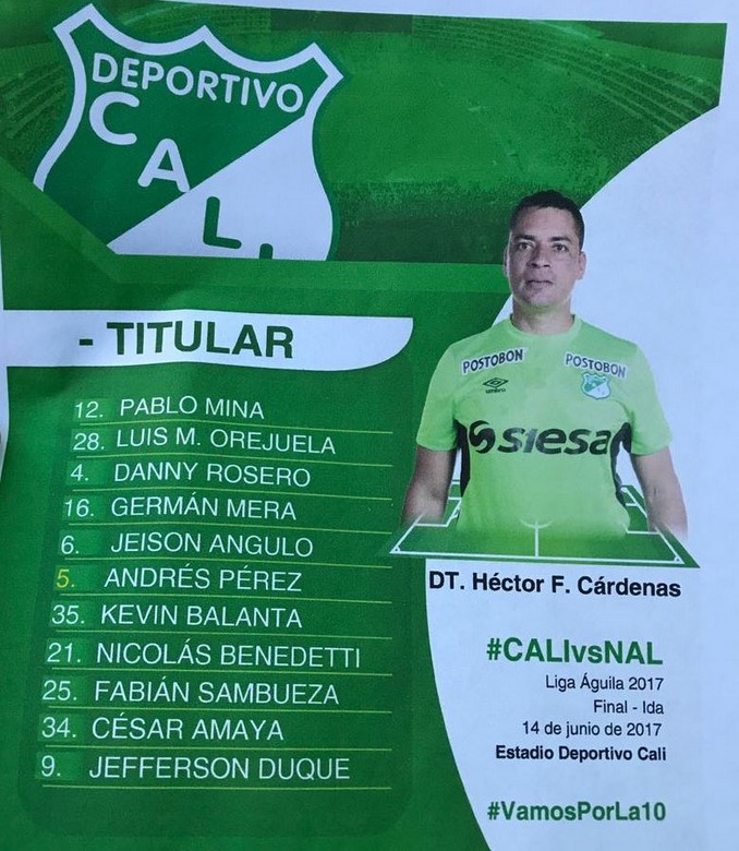 El entrenador Reinaldo Rueda dio a conocer la nómina para el partido de ida de la final de la Liga Águila I-2017, entre Atlético Nacional y Deportivo Cali, que se disputará este miércoles a partir de las 7:30 p.m. en el Estadio Palmaseca.