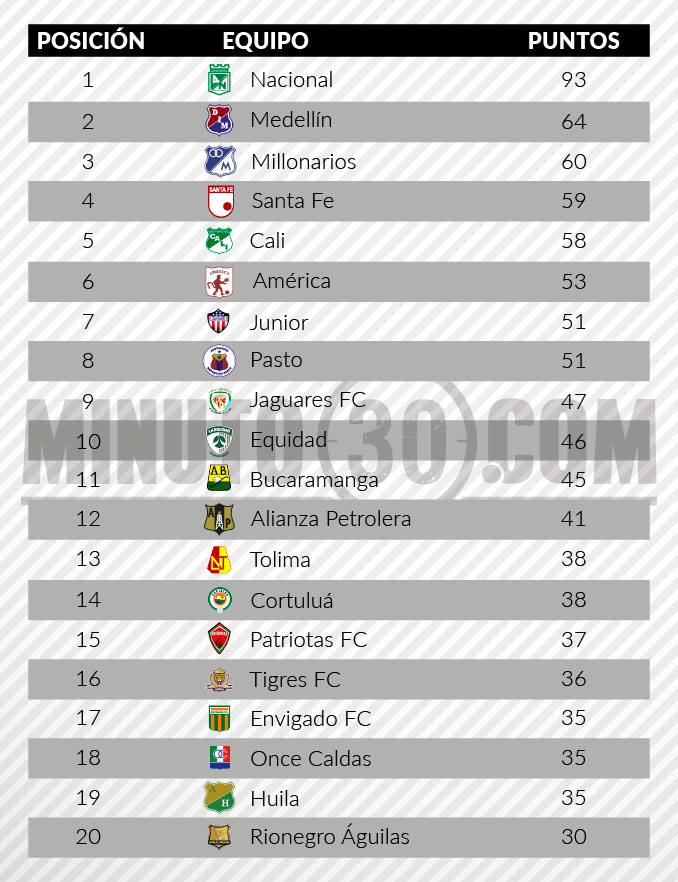 Aunque el ‘Verde’ está por fuera de competencia de los cupos a torneos internacionales, bien vale la pena resaltar su puntaje en esta tabla, en en la que aparece en el primer lugar con 93 unidades, casi 30 de ventaja sobre el ‘Rojo’.
