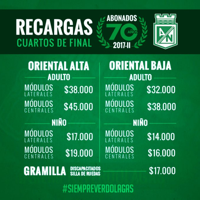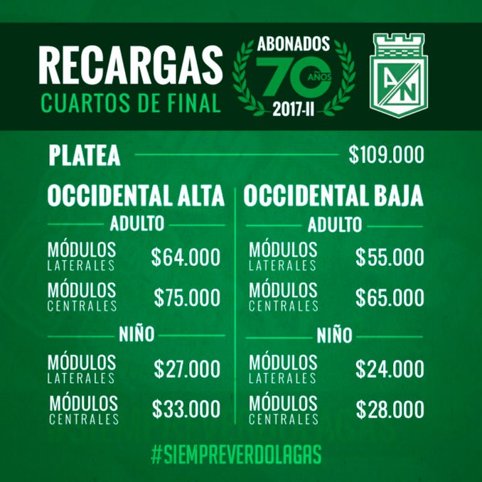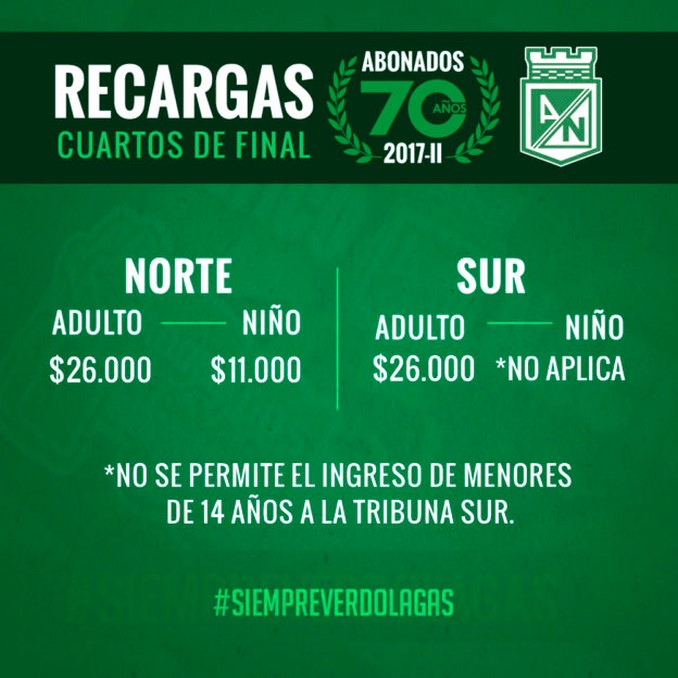 Con varios días de antelación abrió Atlético Nacional las recargaras para sus abonados de cara al partido de vuelta de los cuartos de final de la Liga Águila II-2017 frente a Deportes Tolima.