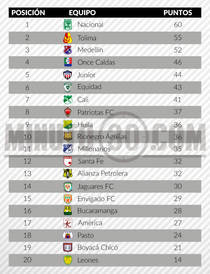 El conjunto ‘Verdolaga’ lidera con holgura el escalafón, con 60 puntos; cinco más que Deportes Tolima, que aparece segundo, pero que no esta en competencia, pues ya tiene asegurada su presencia en el certamen continental de cuenta del título de la Liga I, que justamente le arrebató al equipo antioqueño.