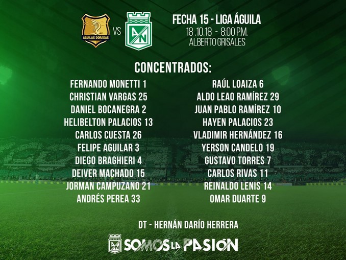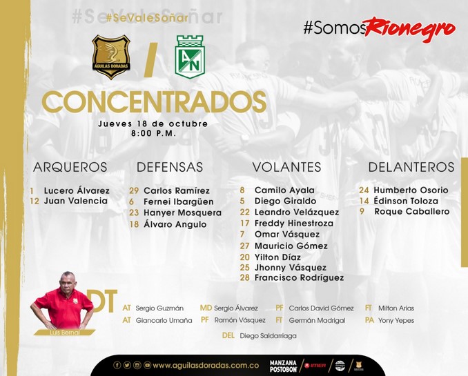 Minuto30.com- Rionegro Águilas Doradas y Atlético Nacional definieron los concentrados para el partido que protagonizarán entre ellos, en desarrollo de la decimoquinta fecha de la Liga Águila II-2018.