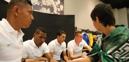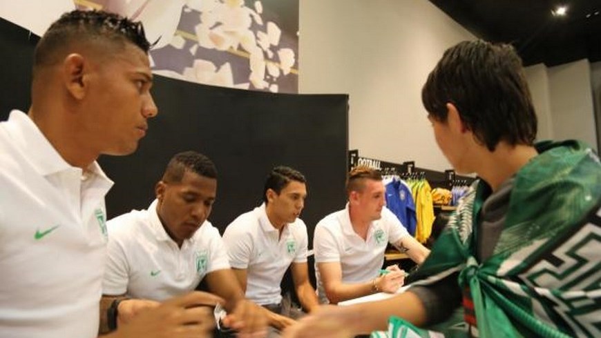Daniel Bocanegra, Alexander Mejía, Franco Armani y Wílder Guisao llegaron al almacén Nike de la calle 116 y reunieron una gran cantidad de hinchas verdes que aprovecharon la ocasión para dejar su recuerdo.