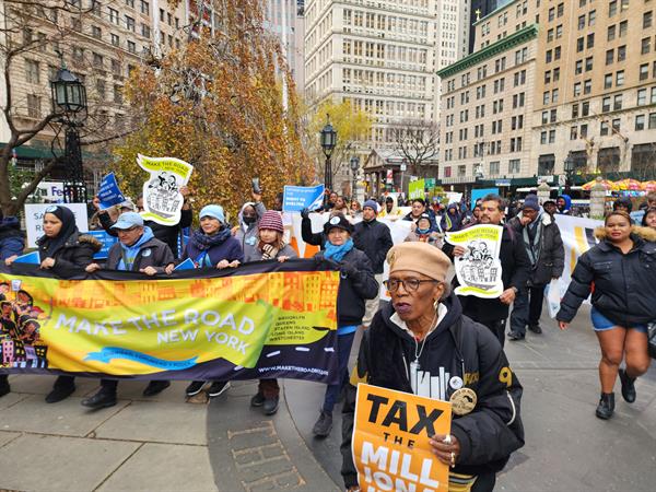 Los manifestantes gritaban "la vivienda es un derecho" mientras se dirigían a la Alcaldía desde el bajo Manhattan; entre los participantes estaba Legal Aid, que ha llevado a los tribunales una nueva norma de la Alcaldía que deja sin efecto ese derecho alegando problemas fiscales.