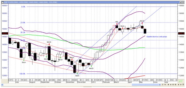 Técnicamente el IGBC (Gráfica semanal), rompió el nivel sicológico de los 15 mil puntos, perforando el soporte Fibonacci de 50% y amenaza con buscar cotizaciones inferiores. El soporte más cercano está en los 14.500 puntos, valor que coincide con la media móvil de 20 semanas.