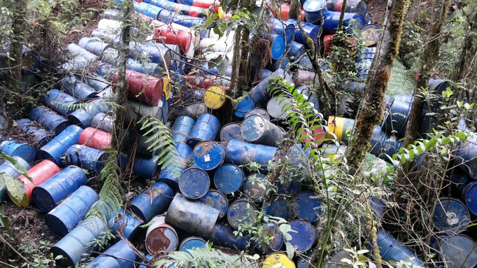 Luego del procedimiento de neutralización del cristalizadero, los miembros del Ejército Nacional y de la Fiscalía General de la Nación que hicieron el hallazgo de esta factoría dedicada a la producción de alcaloides, hallaron muy cerca del lugar 300 canecas metálicas de 55 galones de capacidad cada una, algunas de ellas con restos de guarapo de coca y solventes químicos cubiertos por la maraña de ese sector de La Unión.