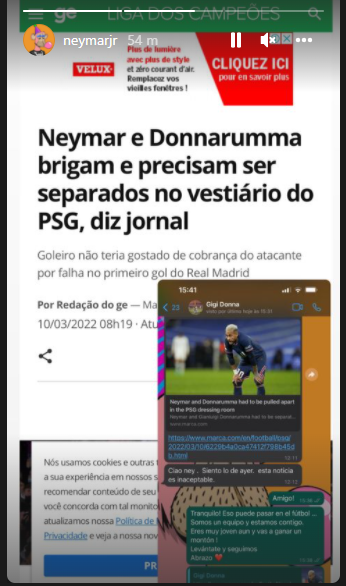 Neymar via stories sobre a suposta briga com Donnarumma pic.twitter.com/qMs0IsE4Wg