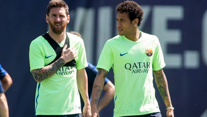 Los jugadores del FC Barcelona Leo Messi (i) y Neymar da Silva (d)
