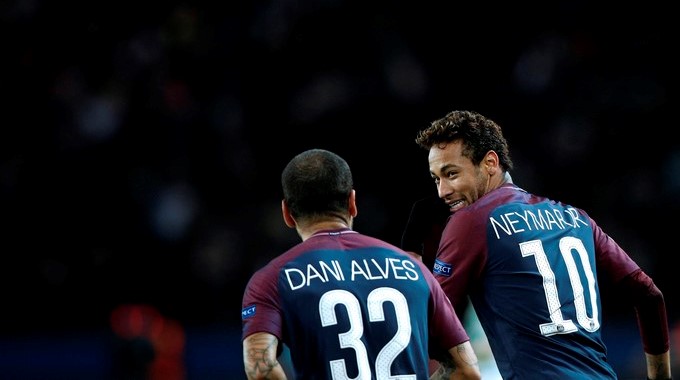 Dani Alves (i) del París Saint Germain celebra con su compañero Neymar